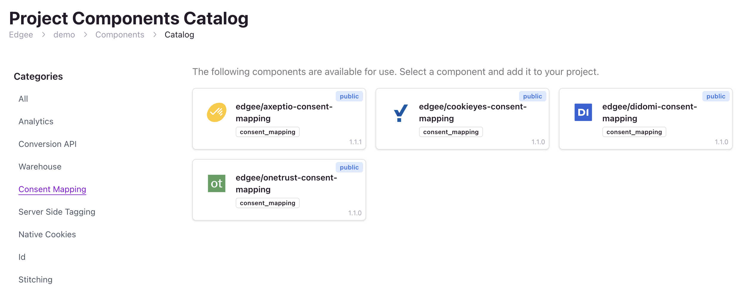 For customers who already have a Consent Management Platform (CMP) in place, Edgee provides Consent Mapping Components that integrate directly with popular CMP solutions (Axeptio, Didomi, OneTrust, CookieYes).